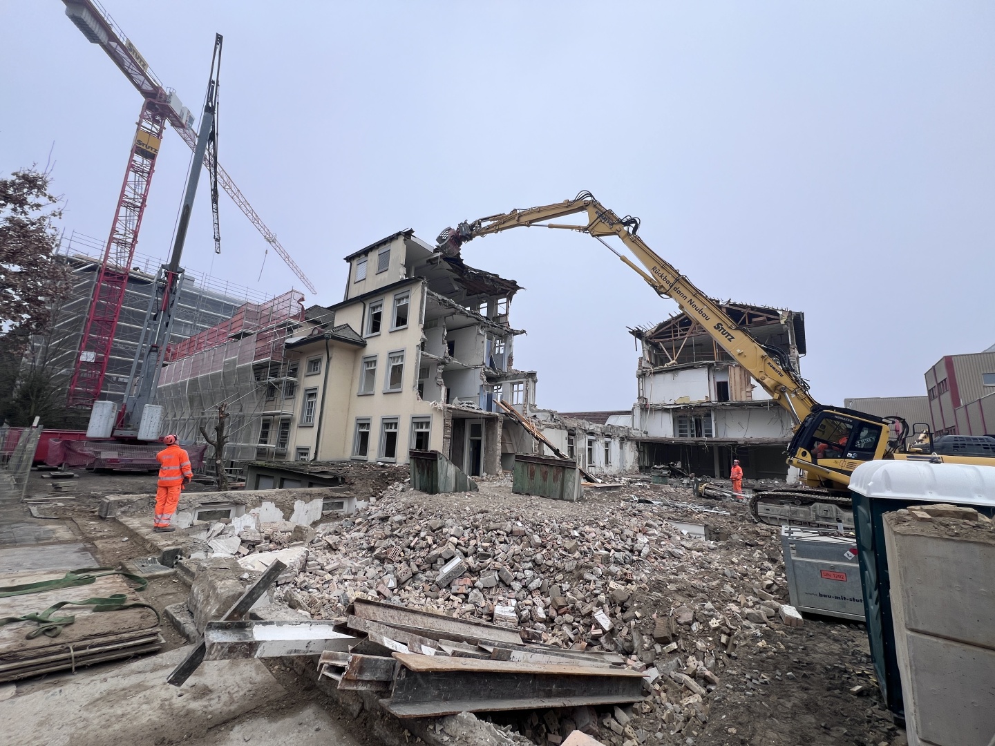 Die Schadstoffsanierung ist abgeschlossen. Der Abbruch des Geschäftshaus ist in Arbeit.